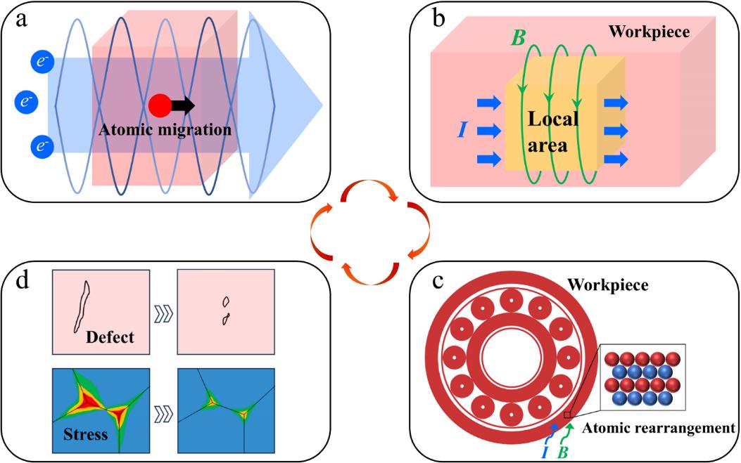 Electromagnetic processing technology (including electric field, magnetic field and electromagnetic field coupling processing) can achieve atomic-scale energy transfer through high transmission rate and high energy flux density, so as to regulate the microstructure and mechanical properties of materials. At present, electromagnetic treatment technology has been applied in industry, but its mechanism and system research are not perfect. This paper summarizes the various effects of electromagnetic treatment, such as energy transfer and action, targeting. extreme spatiotemporal scale characteristics, defect repair effects, etc., as shown in Fig. 1, and reveals the mechanism of electromagnetic treatment through thermal and non- thermal effects.