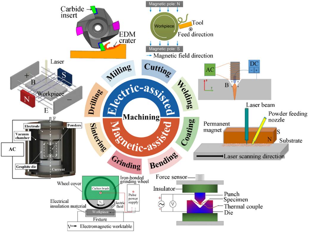 Electromagnetic treatment can significantly improve the processing performance of metal materials, not only in the plastic deformation ability, but also in key mechanical properties such as yield strength and hardness. I n terms of material processing, electromagnetic treatment technology has been successfully expanded to various processes such as cutting, grinding, drilling. welding, sintering, coating, and plastic forming, as shown in Figure 3. Electromagnetic treatment technology has been applied in material preparation, material processing, material forming. additive manufacturing and other fields.