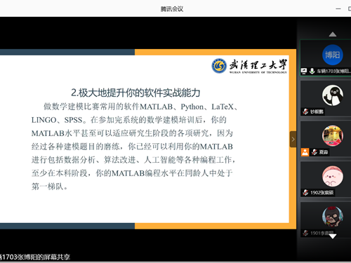 2016级邓植云同学在大二、大三阶段依次斩获数学建模竞赛国家一等奖和美赛二等奖,成功保研至华中科技大学。他主要针对数学建模竞赛中的论文写作部分进行了讲解,同时结合自己在参与竞赛过程中的实际案例,分享了对数模竞赛全周期工作的理解。2017级张博阳同学则从数学建模的性质内涵、对学生综合能力的提升、竞赛备战方法等方面展开探讨。