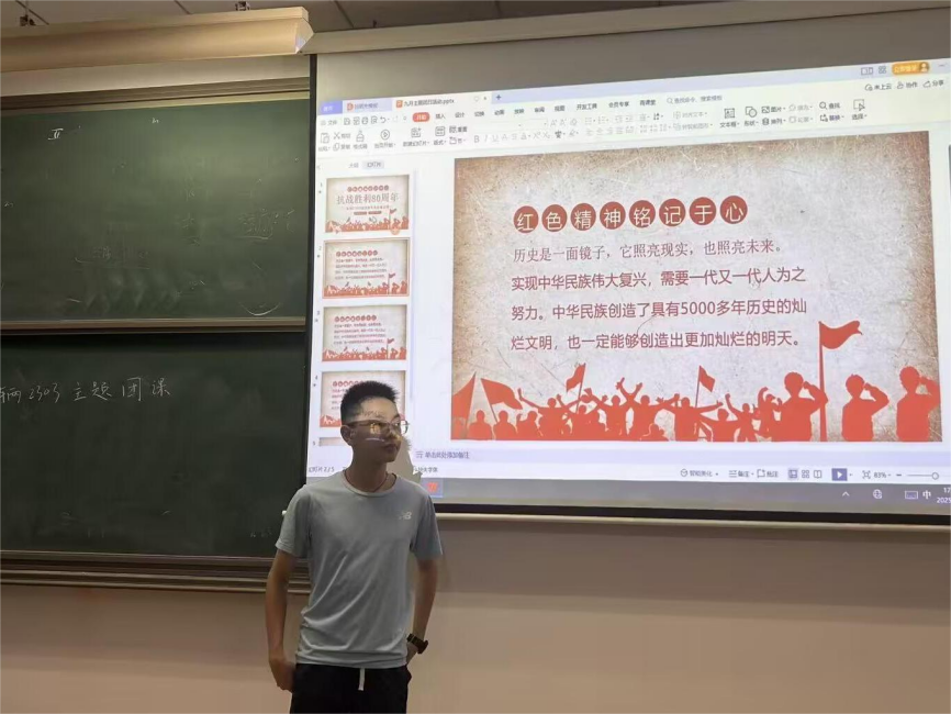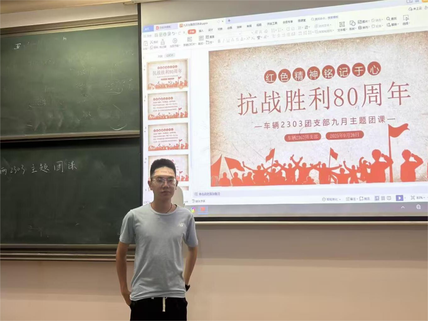 为深切缅怀革命先烈,弘扬伟大的抗战精神,激发青年学生的爱国热情与历史责任感,9月26日上午十点,车辆2303班在致远楼302教室隆重举办了以“弘扬抗战精神,做自豪中国人”为主题的团日活动。本次活动由班级团支书杨佳汶主持,车辆2303班全体同学积极参与。