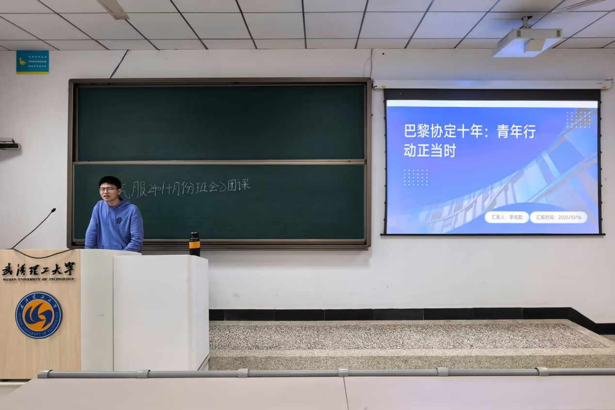 10月16日下午5点,汽服2401团支部在博学东楼107教室开展“巴黎协定十周年”主题团课,团支书李旭阳主持,全班团员参与学习讨论。