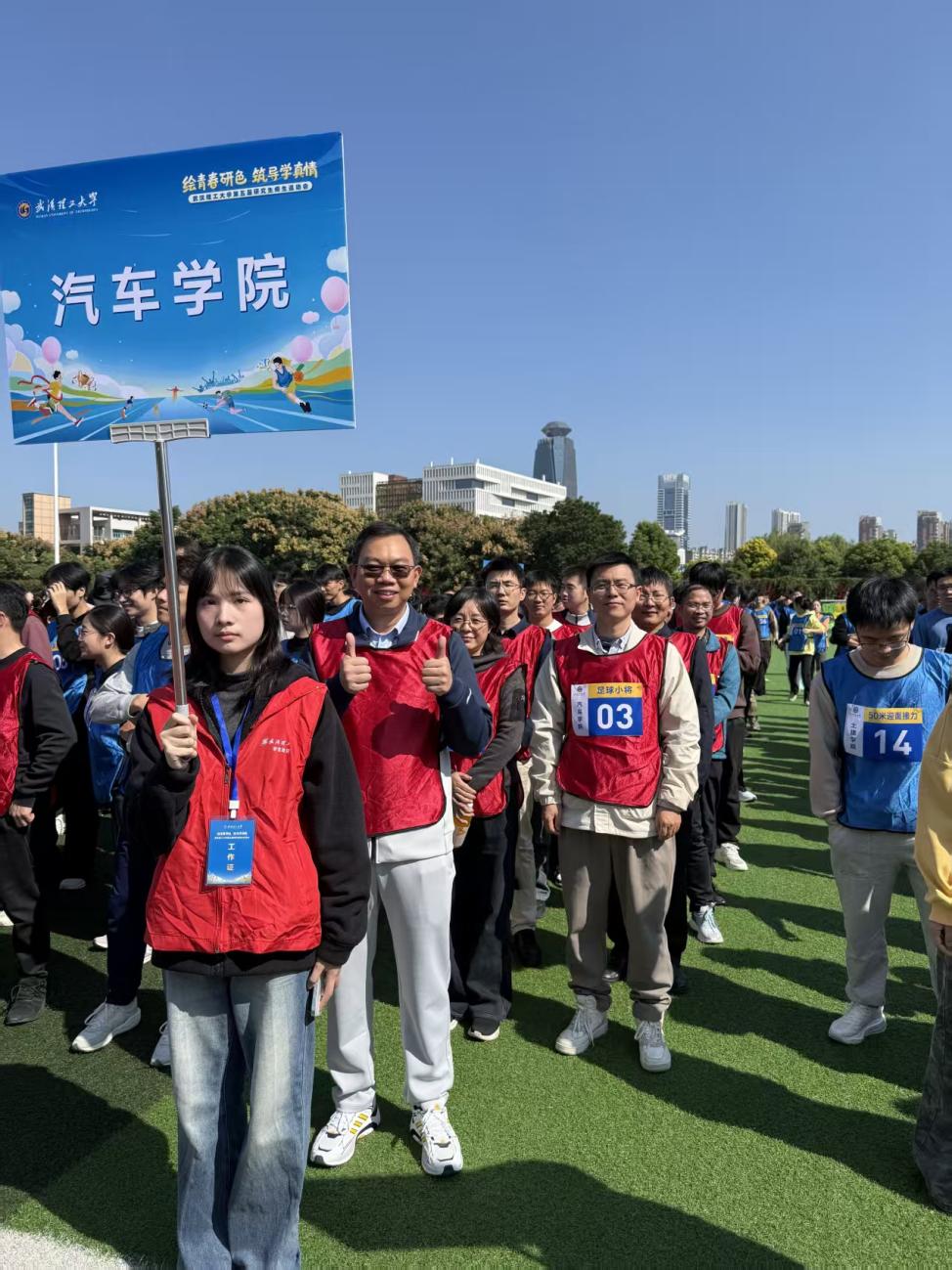 2025年10月23日13时,武汉理工大学第五届研究生师生运动会在南湖校区副田径场隆重举行。汽车工程学院党委副书记蔡春带队参赛,为现场师生们加油鼓劲。学院师生代表团最终凭借出色表现斩获佳绩,位列团体总分第七名,充分展现了学院师生昂扬向上的精神风貌和强大的团队凝聚力。