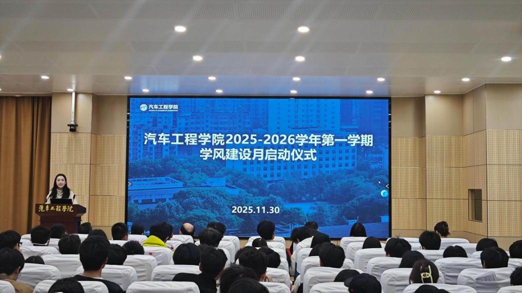 为深入贯彻落实立德树人根本任务,营造勤学笃行的优良学风,11月30日下午,汽车工程学院2025-2026学年第一学期“学风建设月”启动仪式在学院保隆厅隆重举行。学院党委副书记蔡春、本科相关年级辅导员、班主任代表以及各年级学生干部代表参加仪式。仪式由2025级本科生辅导员任佩仪主持。