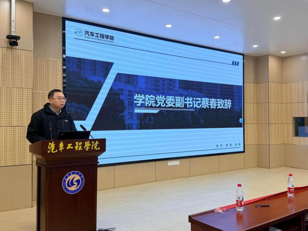 仪式伊始,学院党委副书记蔡春致辞。他首先阐述了优良学风的重要性,并结合国家教育强国、科技强国、人才强国建设的战略部署,强调了学风建设对于培养汽车行业拔尖创新人才的深远意义。蔡书记对全体同学提出四点希望:一是要立根铸魂,在专业学习中坚定“汽车强国”的使命方向;二是要笃学精进,打牢核心基础课程的基本功;三是要敢闯善试,在产学研融合中锤炼真本领;四是要协同共进,发挥宿舍最小细胞作用,在结伴同行中温暖成长。他同时勉励同学们珍惜时光,将好奇与探索汇聚成未来的创新底气,成长为“眼里有光、手上有活、心中有梦”的汽车人,并预祝学风建设月活动取得圆满成功。