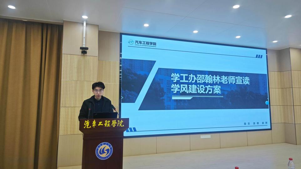仪式第二项,由2022级本科生辅导员邵翰林宣读《汽车工程学院学风建设实施方案》。方案明确了以立德树人为根本任务的指导思想,设定了实现“四个显著”的工作目标,并系统阐述了涵盖加强调查研究、深化教学联动、创新教育载体、严格过程管理、优化帮扶体系、打造品牌活动、实施分类指导等七个方面的具体工作措施,为构建具有学院特色的学风建设长效机制提供了清晰路径与有力保障。
