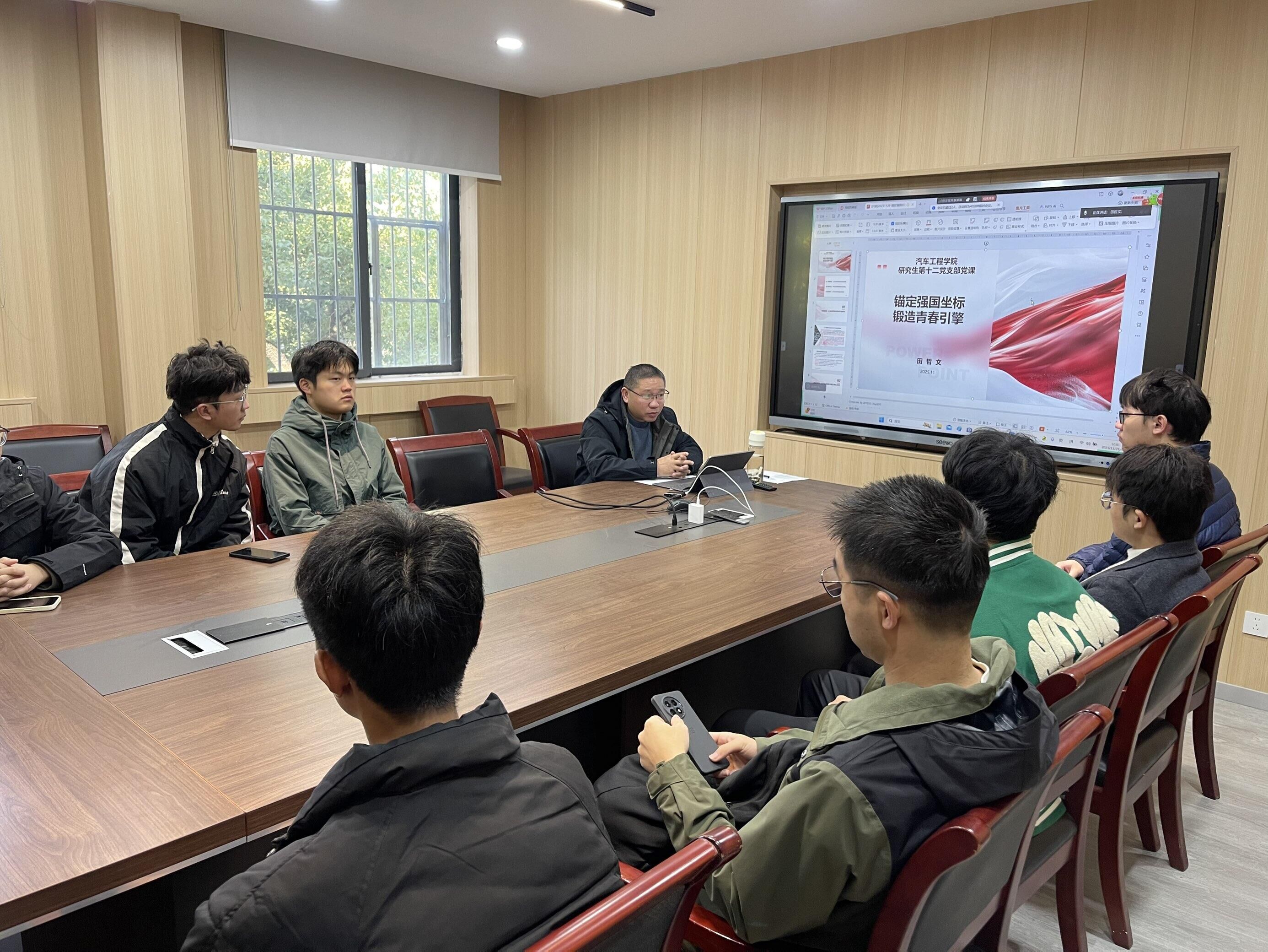 为深入贯彻党的二十届四中全会精神,引导研究生党员将专业所长融入“十五五”规划实施实践,以青春力量驱动汽车产业新质生产力发展,11月29日上午,汽车工程学院研究生第十二党支部“锚定强国坐标,锻造青春引擎”主题党日活动在学院实验中心会议室举行。活动由支部指导教师田哲文老师主讲,支部全体党员参会。