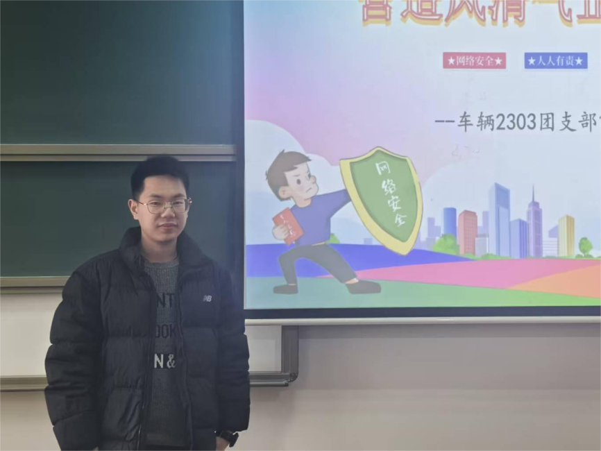 为帮助同学们树立正确的网络价值观,增强网络安全防范意识,营造健康文明的网络氛围,12月15日下午四点,车辆2303班在致远楼302教室成功开展“营造风清气正的网络环境”主题团课。本次团课由杨佳汶主持,车辆2303班全体同学参与。