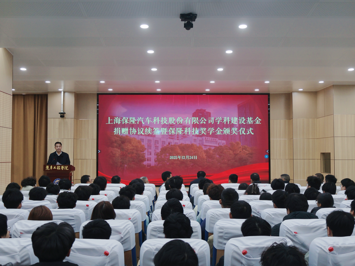孟芳兵书记对陈洪凌校友一行的到来表示热烈欢迎,并感谢保隆科技长期以来对学校学科发展与人才培养的大力支持,他简要介绍了学校近年来取得的成就。孟书记指出,保隆科技作为智能悬架等细分领域的全球领先供应商,与学校的合作不断深化,早在2017年就向学校捐赠1000万元,用于支持学校汽车学科条件建设;2023年冠名保隆科技报告厅,改善学校教学与学术交流硬件条件;2024年与学校联合成立智能线控底盘实验室并推动首个研发项目取得显著进展;此外还设立了“保隆科技奖学金”、提供实习就业岗位,为学校高水平学科建设、高质量人才培养做出了突出贡献。他期待校企双方以此为契机,携手培育更多汽车行业高素质人才、产出更多高水平科技成果,在服务教育强国、科技强国、人才强国、汽车强国建设中作出新的更大贡献。孟书记还向26名获奖学生表示祝贺,寄语同学们常怀感恩之心、锤炼过硬本领、勇担时代使命,将个人理想融入国家发展大局,在振兴中国汽车工业中成就卓越人生。