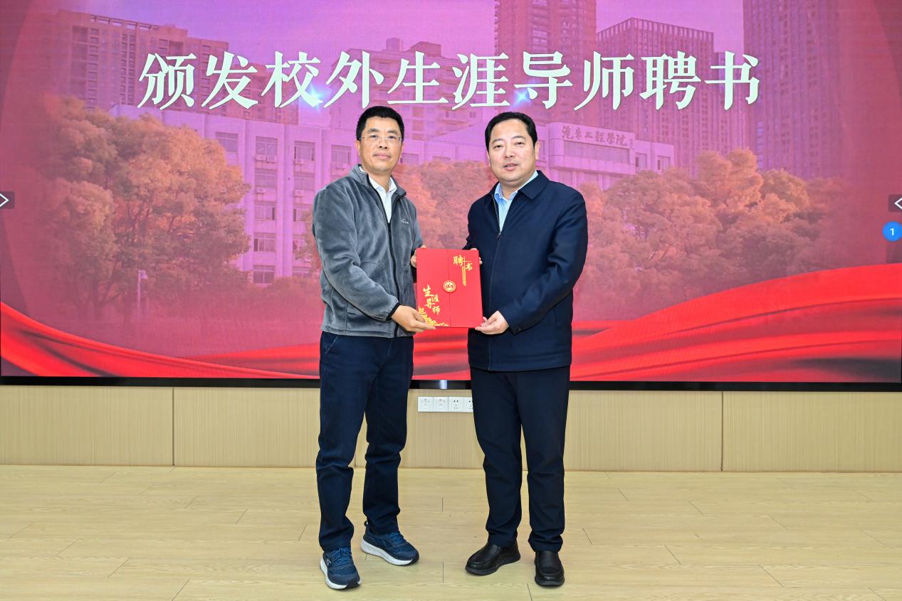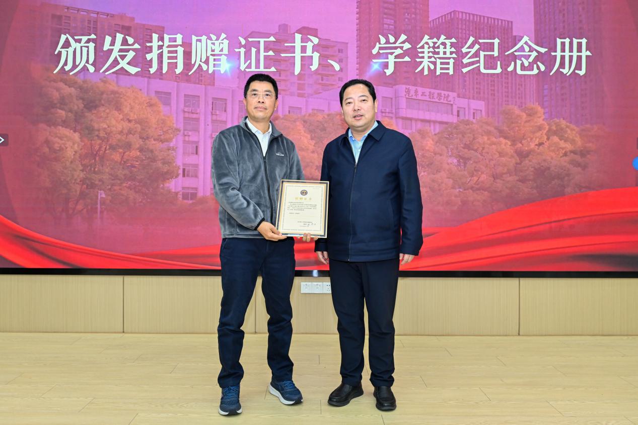 孟书记向陈校友颁发捐赠证书,并聘任其担任学校校外生涯导师。