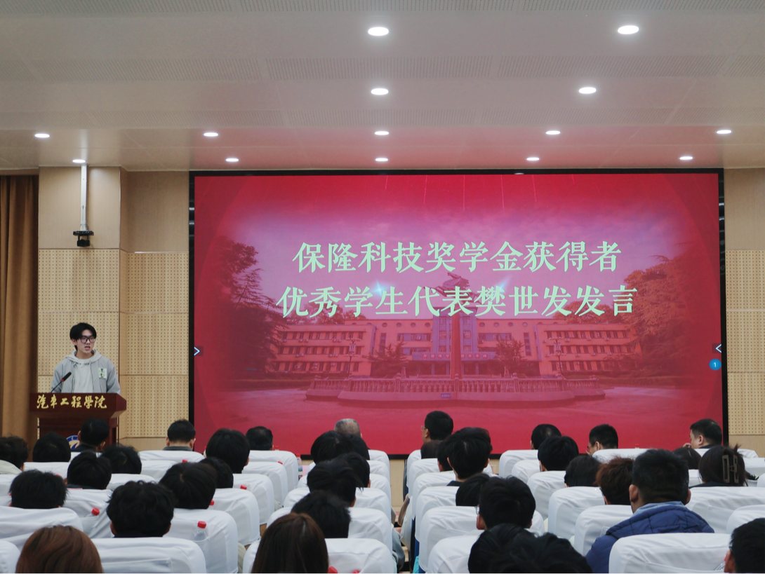 获奖学生代表樊世发上台发言。樊世发同学首先对保隆科技的慷慨捐赠和学校的悉心培育表示感谢。未来,他将以优秀校友为榜样,珍惜大学时光、锤炼过硬本领,立志在民族汽车工业崛起的浪潮中书写青春华章。