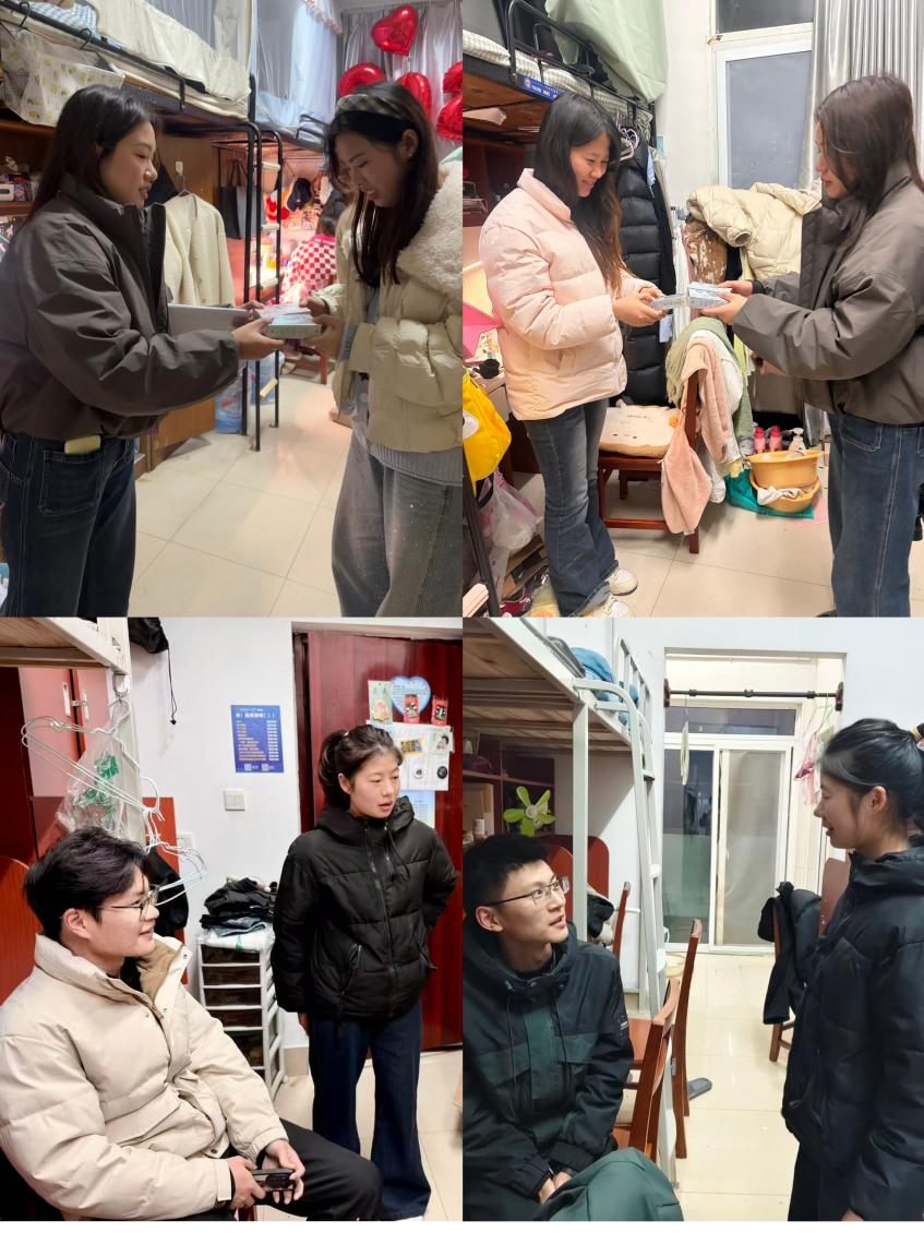 3月8日,辅导员们深入学生楼栋开展宿舍安全卫生检查,围绕用电安全、内务整洁、违禁品管控等重点逐项排查隐患,倡导同学们营造文明和谐的宿舍氛围。走访中,辅导员在指出问题、督促整改的同时,与学生亲切谈心交流,细致了解大家新学期学业规划、科研进展和生活需求,切实为学生排忧解难。同时,恰逢三八妇女节,三位辅导员借此次宿舍走访的契机,为全体女生送上了学院精心准备的节日礼物。