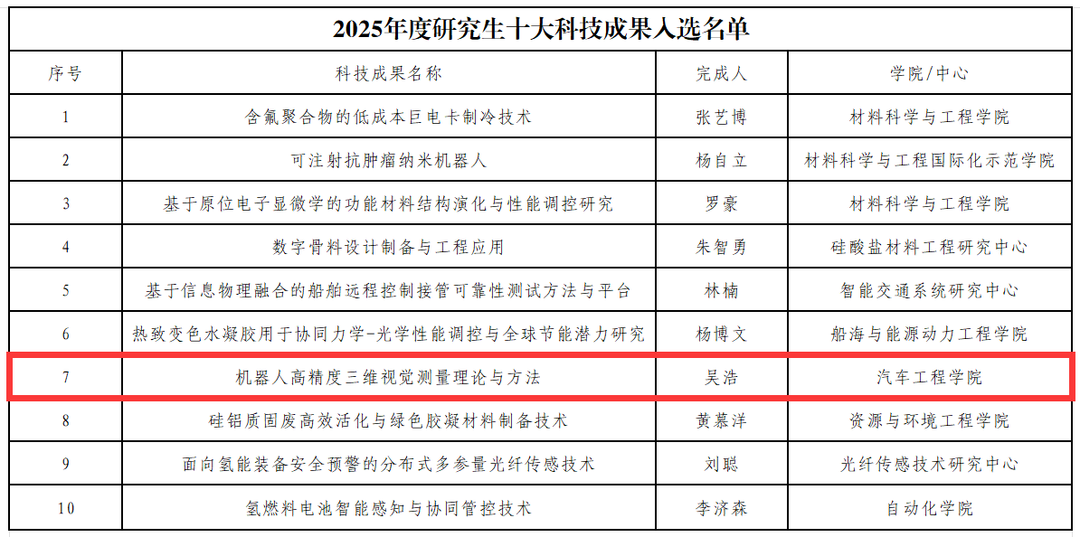 为深入贯彻落实科技创新与研究生教育高质量发展要求,激励研究生潜心科研、勇于创新,学校开展2025年度研究生十大科技成果遴选申报工作。近日,评选结果揭晓,我院博士生吴浩的科技成果《机器人高精度三维视觉测量理论与方法》成功入选。该生由朱大虎教授、华林教授、丁汉院士共同指导。